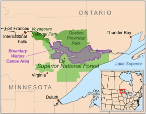 The Boundary Waters Canoe Area Wilderness (BWCAW or BWCA), is a 1,090,000-acre (4,400 km2) wilderness area within the Superior National Forest in northeastern part of the US state of Minnesota under the administration of the U.S. Forest Service. A mixture of forests, glacial lakes, and streams, the BWCAW’s preservation as a primitive wilderness began in the 1900s and culminated in the Boundary Waters Canoe Area Wilderness Act of 1978. It is a popular destination for both canoeing, hiking, and fishing, and is one of the most visited wildernesses in the United States.[2]:10